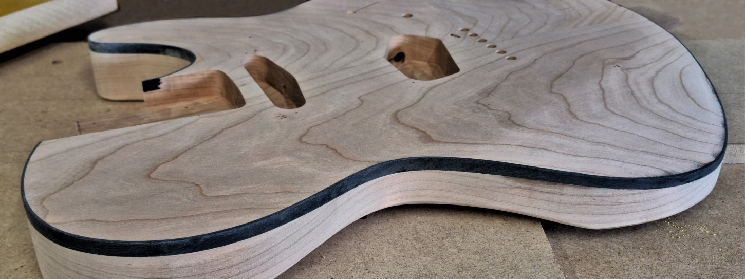 We use two-piece body construction as standard. We also offer multi-piece (3 or 4) bodies as a cost-saving measure, which are particularly well-suited to builds using opaque finishes. For a limited number of woods, one-piece bodies are also a possibility, though the body shapes can be slightly limited based on the specific piece of wood that is available.
