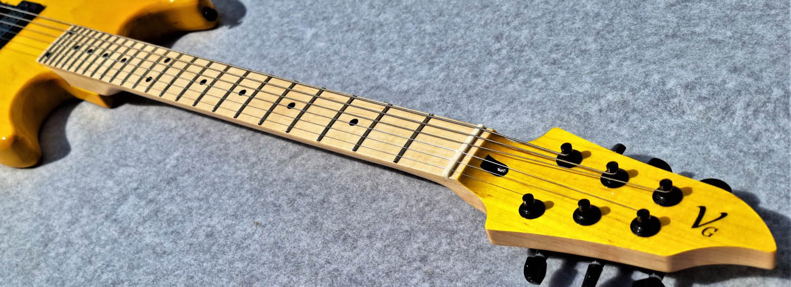 For angled-headstock necks, we can bind both the fretboard and headstock, or just the fretboard alone. For flat-headstock necks, only the fretboard can be bound.